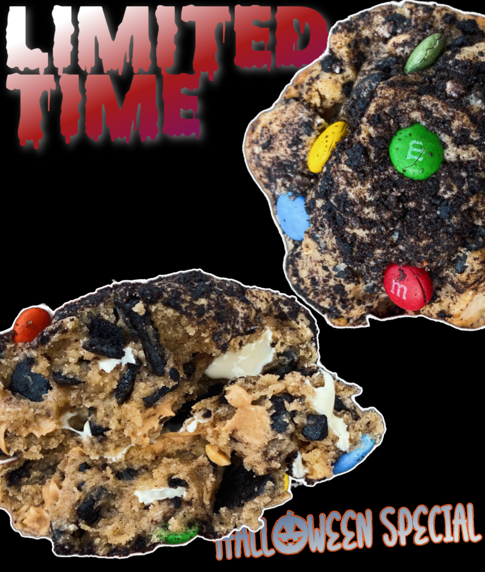 GRAVEYARD KOOKIE features KyKy's Nutella Oreo kookie, with chunks of Oreos, dark chocolate chips, M&M's, topped with peanut butter M&M's.
